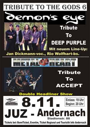 Das “Tribute To The Gods” Festival/Konzert in Andernach, Juz geht in die sechste Runde. Auf vielfachen Wunsch folgt nach 2023 noch einmal die beste europäische DEEP PURPLE Tribute Band DEMON´S EYE aus Siegen und als erste Band die einzige deutsche ACCEPT Tribute Gruppe METAL HEART aus dem Saarland, die vor allem mit ihrem Sänger Norman Müller punkten können, der Udo Dirkschneider sowohl in Stimme, als auch Aussehen sehr nah kommt.