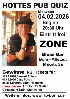 das Jahr 2025 neigt sich dem Ende entgegen und wir arbeiten unter Hochdruck am Programm von 2026. Bisher sind es 52 Konzerte, weitere folgen. Wir haben wie immer ein abwechslungsreiches Programm erstellt über Tribute, Blues, Metal, Liedermachern, Jazz etc. mit vielen alten Bekannten und neuen Highlights. Ein Knüller ist am 29.3. COLOSSEUM Köln, Stollwerck. Die legendäre englische Prog, Rock, Blues Band aus den 70er Jahren kommt wieder auf Tour, sogar mit neuem Album. Dazu viele schöne Konzerte in der Bonner Harmonie, u.a. feiern KILLERZ-„Tribute To IRON MAIDEN“ ihr 25jähriges Bestehen mit 2 Konzerten (unterschiedliche Set Lists) Tickets gibt es wie immer an den Vorverkaufsstellen z.B. Kaufhof Bonn, Touri Zentrale Bonn, Springmaus VK, Internet, Harmonie Theke, Kubana Siegburg Wellnesstheke, Andernach Touri.