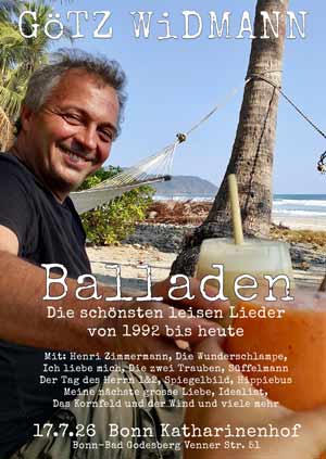 GÖTZ WIDMANNBalladen- die schönsten leisen Lieder von 1992 –Heute.17.7.2026 Bonn, Katharinenhof Vennerstr. 51 Beginn: 19.00 Uhr Open Air Bestuhlt