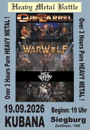 „HEAVY METAL BATTLE“GUN BARREL,WARWOLF NECK CEMETERY19.09.2026 Siegburg Kubana Zeithstr.100 Beginn: 19.00 Uhr VK: 25 Euro+Gebühr